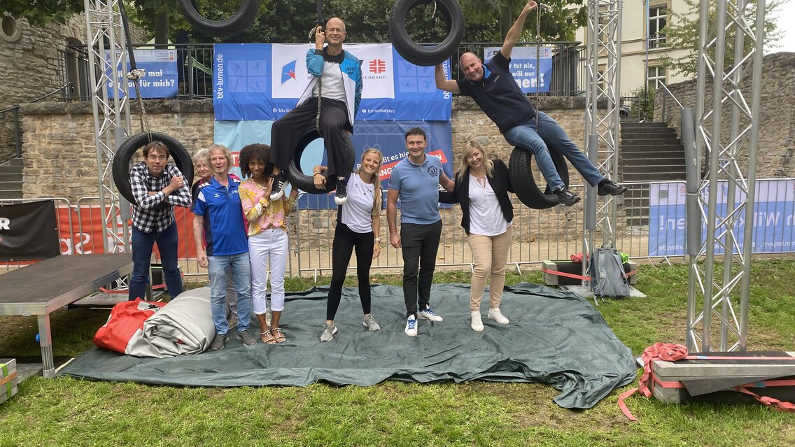 Die Teilnehmerinnen und Teilnehmer ließen sich ganz schön hängen - zumindest für das Gruppenfoto beim Turn-Warrior. Dieser hatte ebenfalls in Schweinfurt Station gemacht. Eigentlich wollten die Funktionäre sich durch den Parkour kämpfen. Aber die Sitzung hat so lange gedauert, dass die Turn-Warrior-Crew schon beim Abbauen war.