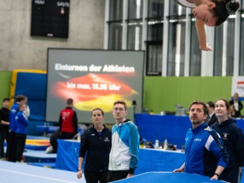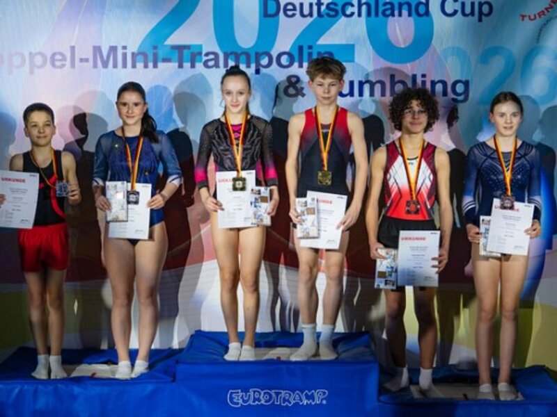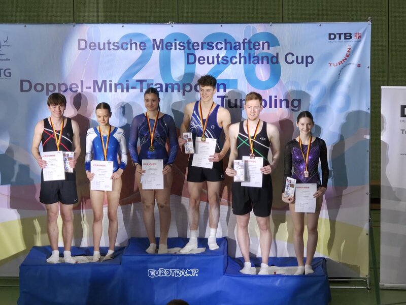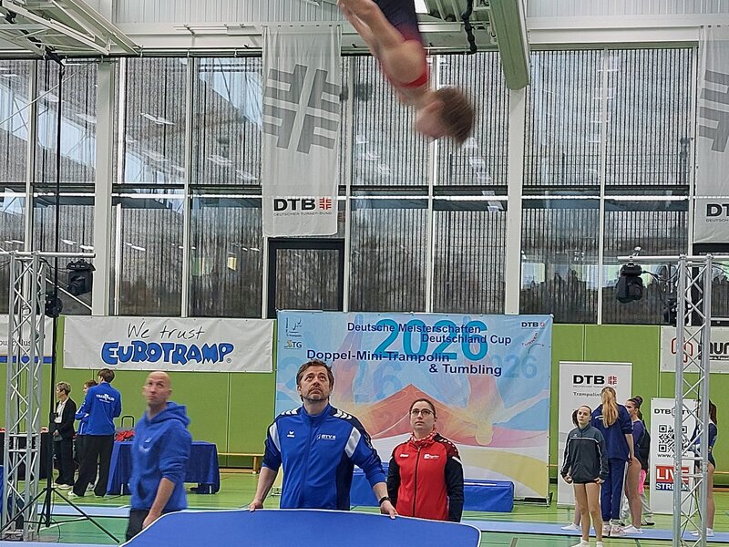 Mit einem beeindruckend starken Teilnehmendenfeld waren Athletinnen und Athleten von Vereinen des Bayerischen Turnverbands vom 28.02.-01.03.2026 in Biberach bei der Deutschen Meisterschaft und dem Deutschland Cup im Doppelminitrampolin sowie erstmals beim Deutschland Cup im Tumbling vertreten. Über 60 Athletinnen und Athleten aus sieben bayerischen Vereinen gingen in Biberach an den Start und sorgten für viele sportliche Highlights.